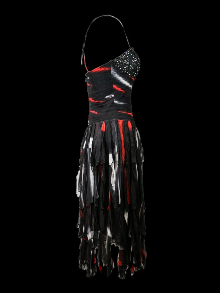 “Sun dress midi, in black silk crepe with subtle red and white line print. Beaded cups on the chest, gathered bodice, and fringed skirt with cascading ruffles. Thin crossed straps. Perfect for a night out or party. This sun dress midi is the epitome of style and glamour, designed by Nuria Aymerich. The black silk crepe fabric is adorned with a delicate print of subtle red and white lines, adding a touch of sophistication to the dress. The beaded cups on the chest bring a hint of sparkle and shine, elevating the overall look. The gathered bodice creates a flattering and feminine silhouette, while the fringed skirt with cascading ruffles adds movement and drama to the dress. The thin crossed straps add an elegant and chic touch to the design. Whether you’re attending a glamorous evening event or a fun-filled party, this sun dress midi by Nuria Aymerich is sure to make a statement. Its combination of luxurious fabric, intricate details, and trendy design elements make it a perfect choice for a night of celebration and style.”