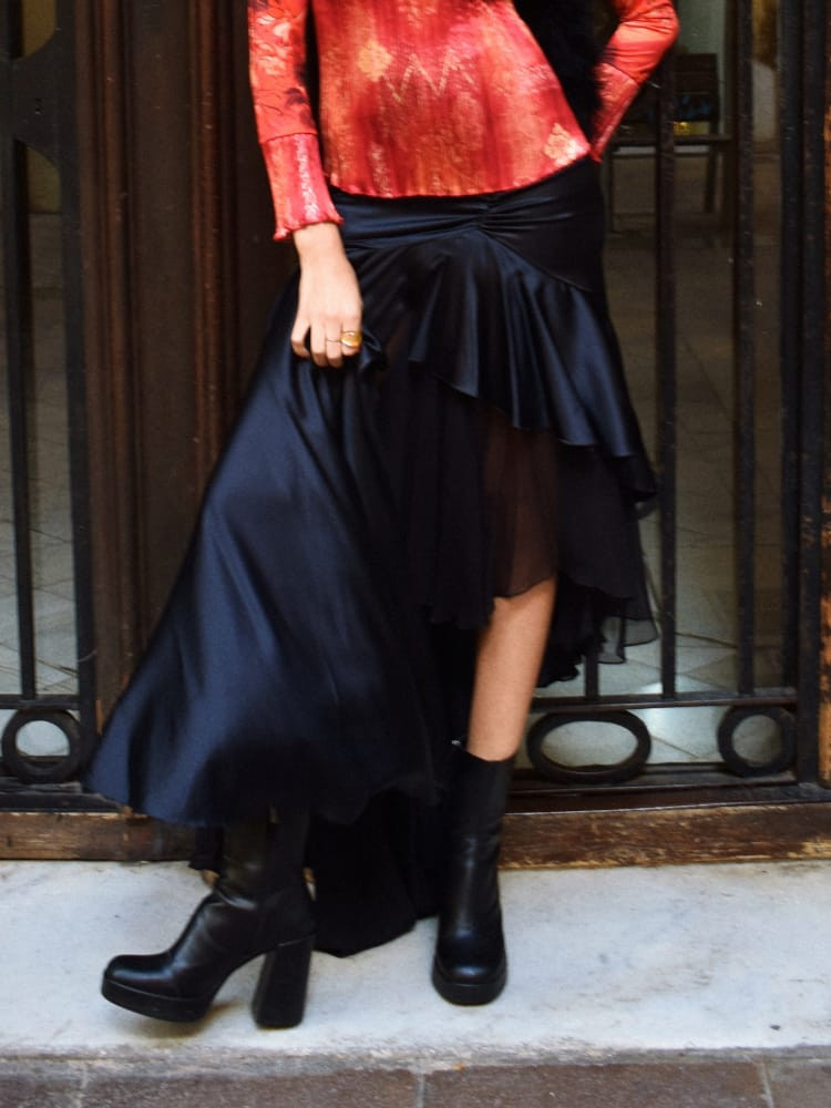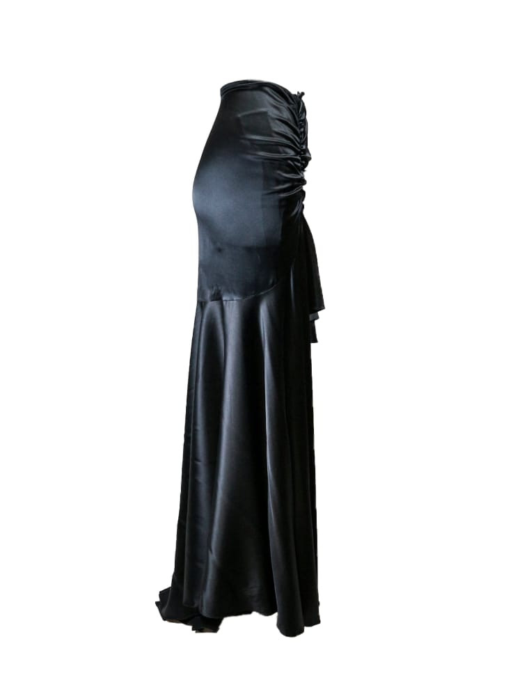 Falda de satén negra con cola y abertura en la pierna.
