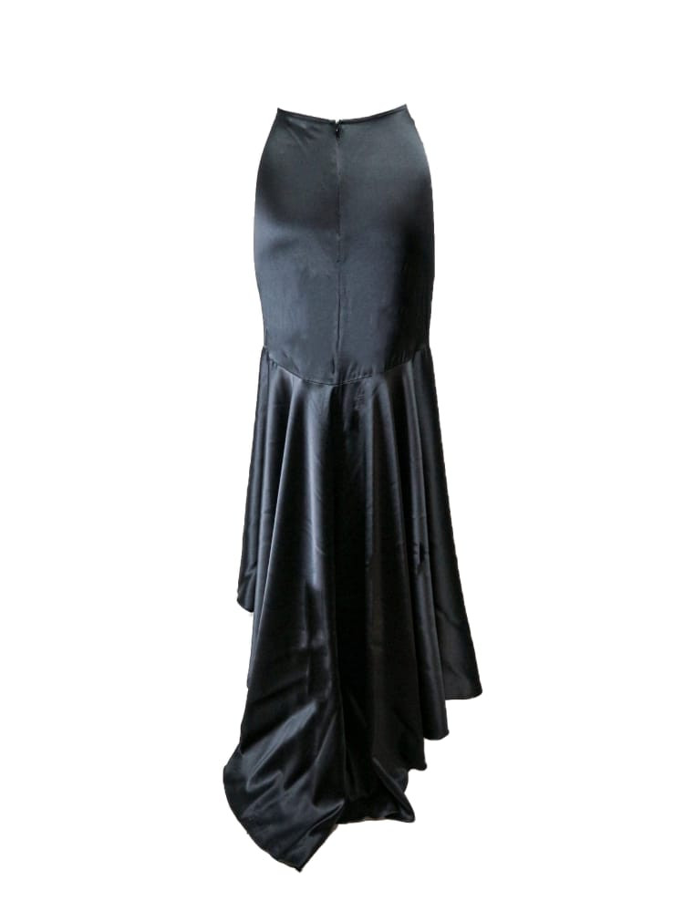 The black satin provides a smooth and luxurious finish, while the train adds an element of grace and movement. The leg slit subtly reveals, creating an elegant and flattering silhouette.