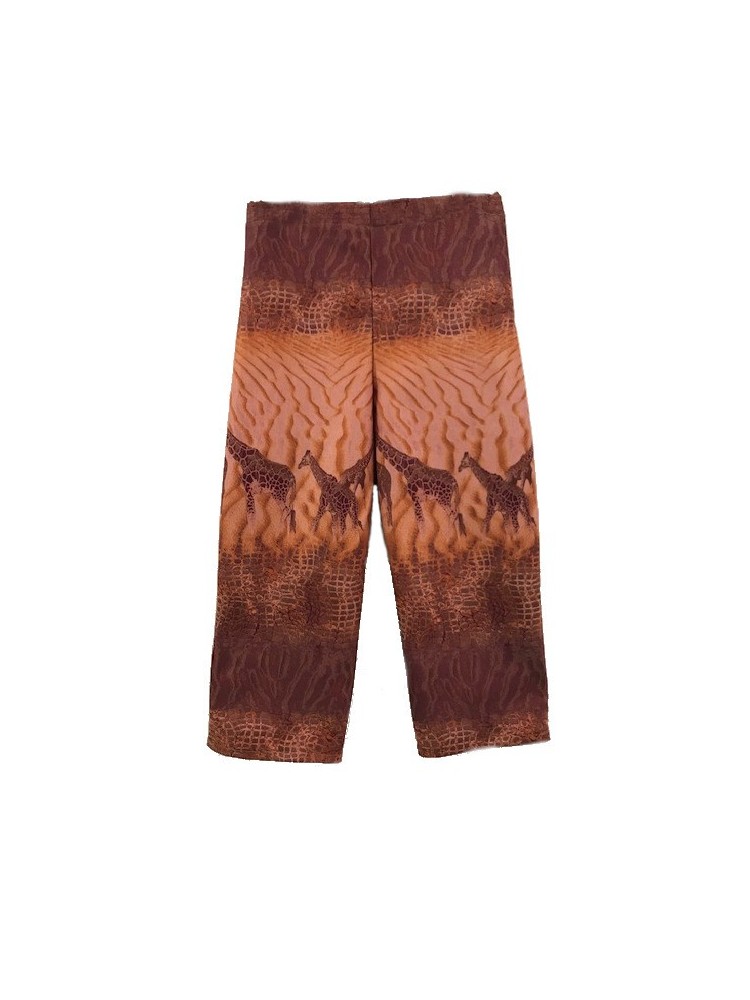 Pantalón pirata con estampado de jirafas en tonos rojos y tierra. Estilo urbano y original con tejido tejano elástico.