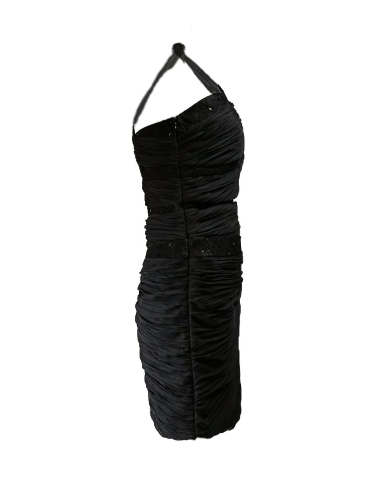 Meticulous draping and the asymmetrical silhouette gracefully enhance the figure, offering a sense of fluid and elegant movement. The classic black color complements the sophistication of the design, making it a versatile piece for a wide range of occasions, from formal events to special evenings.
