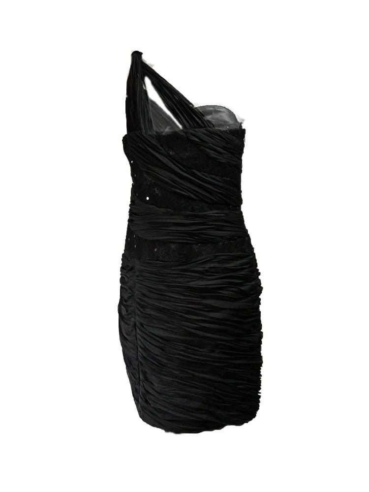 El drapeado meticuloso y la silueta asimétrica realzan la figura con gracia y ofrecen una sensación de movimiento fluido y elegante. El color negro clásico complementa la sofisticación del diseño y lo convierte en una pieza versátil para una amplia gama de ocasiones, desde eventos formales hasta veladas especiales.