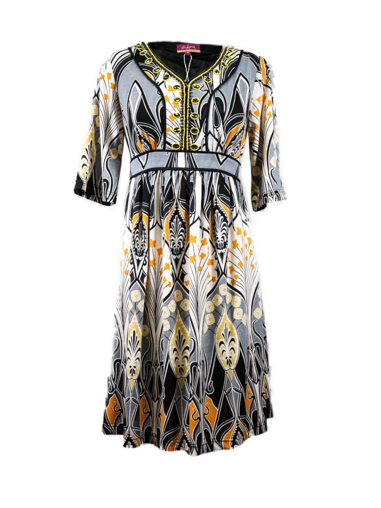 Vestido de media manga con estampado geométrico estilo Art Déco en tonos mostaza, negro, gris y blanco. Corte imperio que estiliza y escote decorado con bordados.
