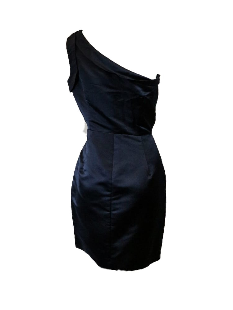 Vestido tulip con hombro asimétrico en azul marino, con una rosa de tela en el hombro y un tejido ligeramente satinado